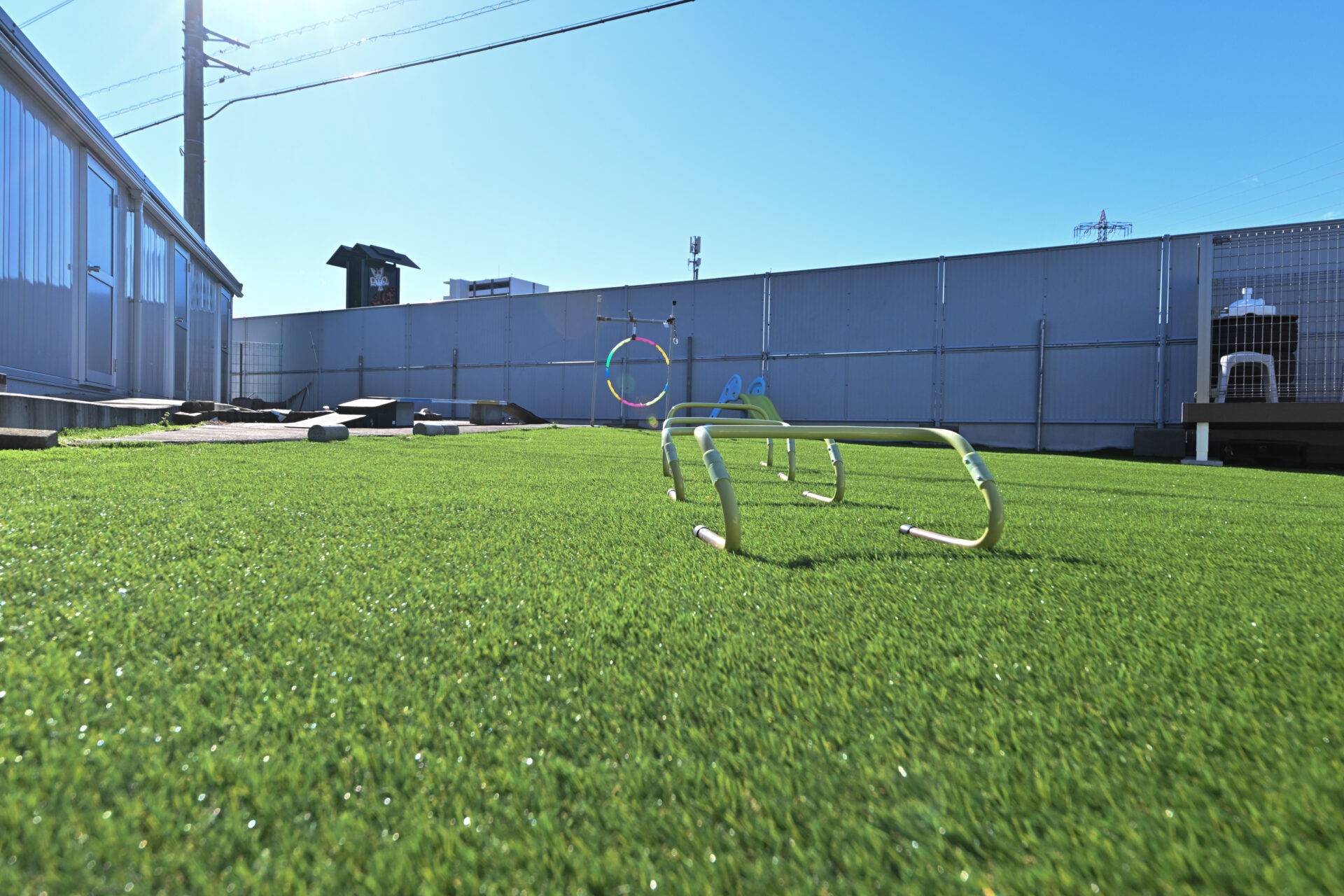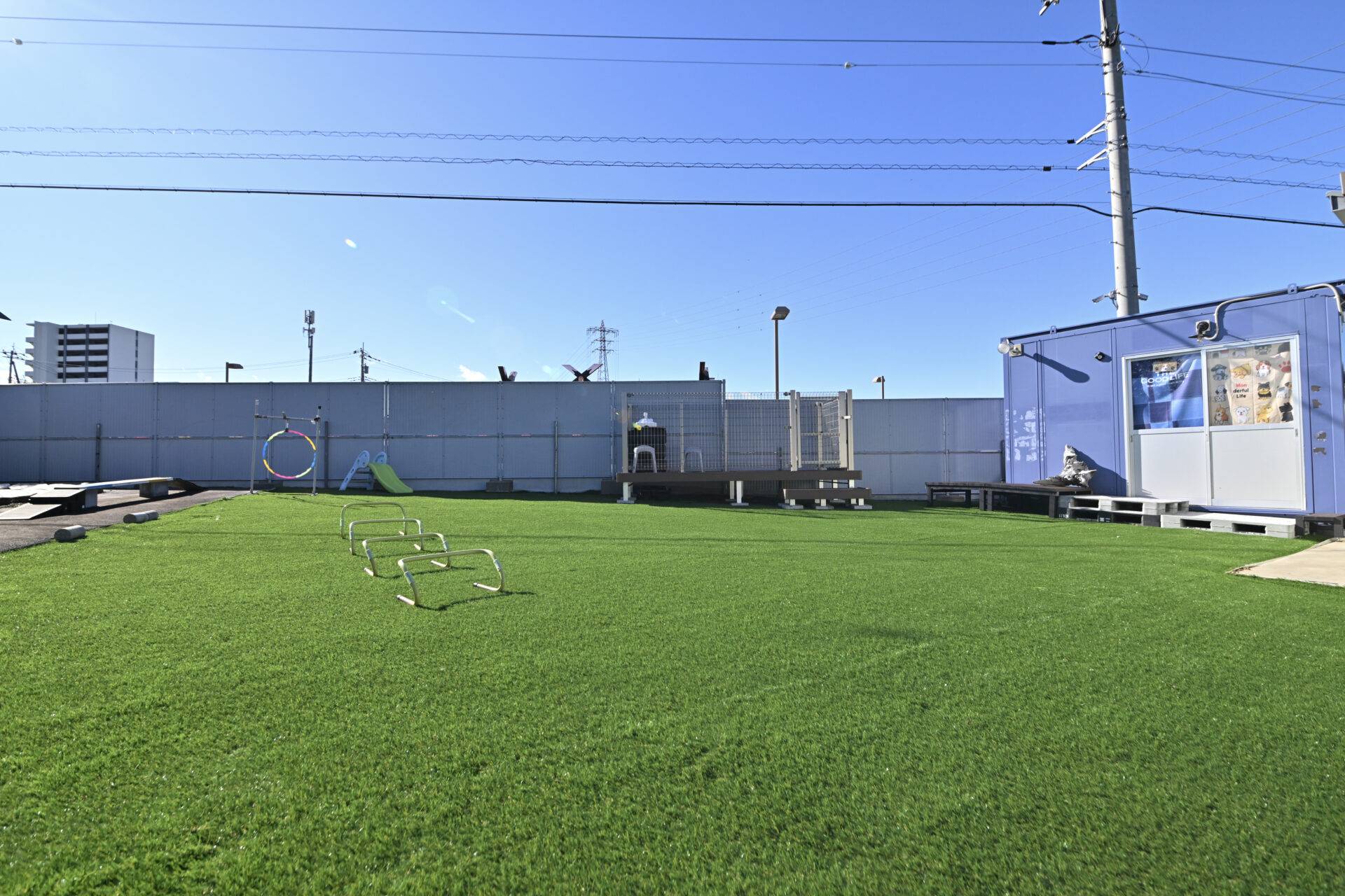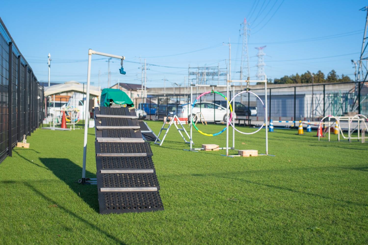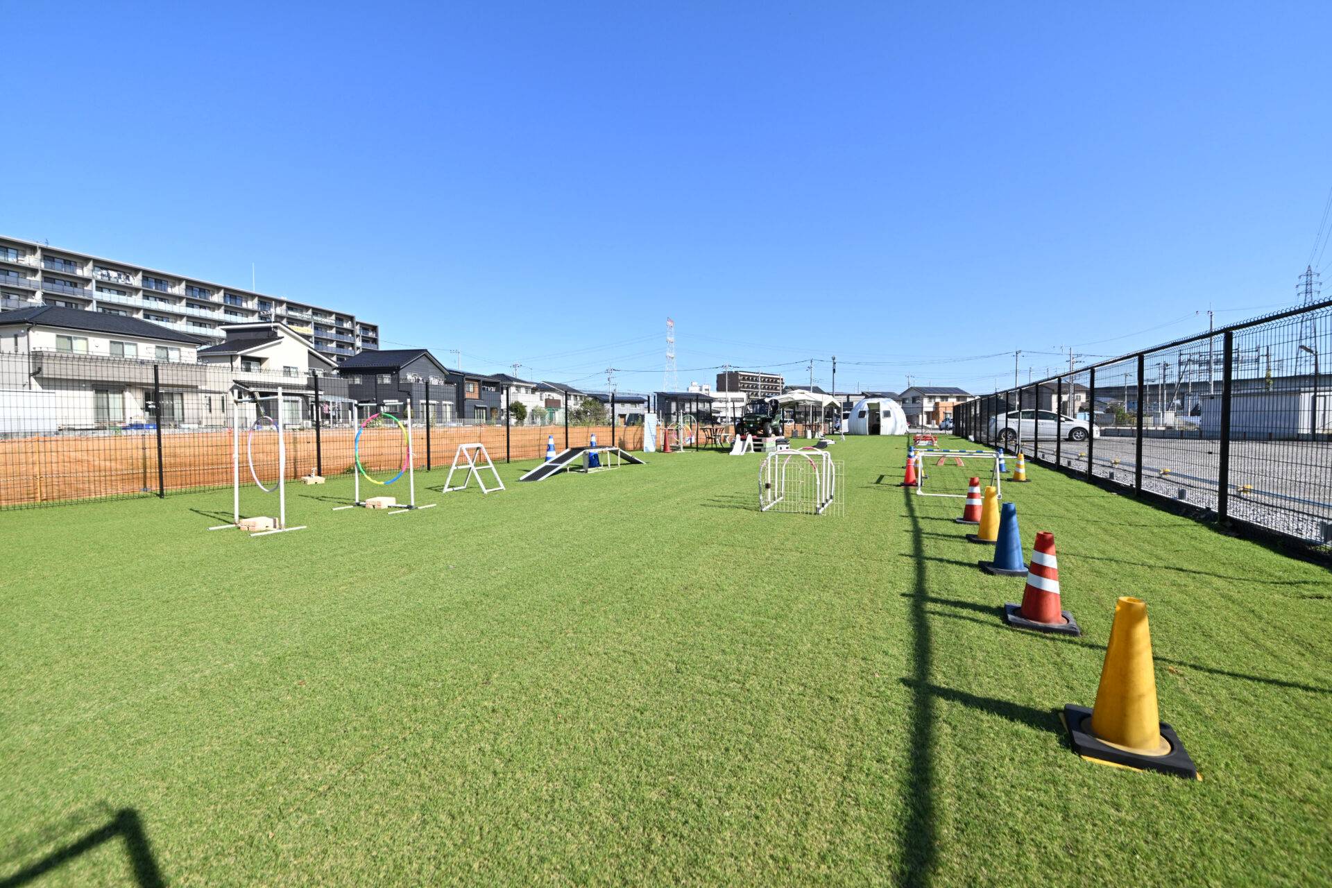 十分な広さを持つメインエリア。臨機応変な利用が可能で、設置された遊具などもご自由にお使いいただけます。活発なワンちゃんが思い切り走り回ったり、本格的なトレーニングを行ったりするのに最適です。
